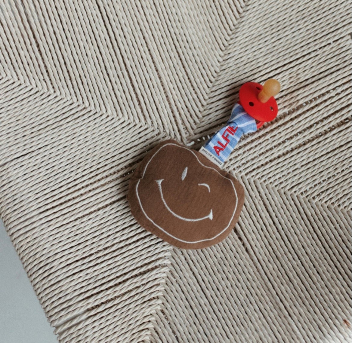 Dit gezellige appeltje is de POMME CUDDLE, een lieve smiley die de speen van je kleintje bewaakt. POMME CUDDLE houdt ook heel erg van knuffelen en doet dat het liefste met jouw kleintje. Gemaakt van super zacht mousseline katoen.