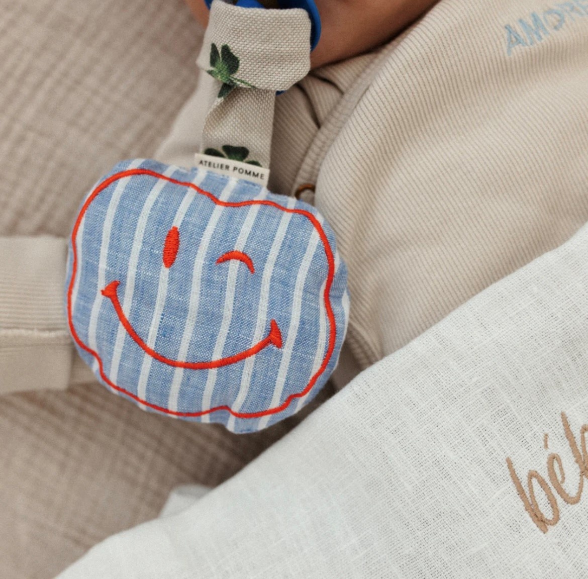 Dit gezellige appeltje is de POMME CUDDLE, een lieve smiley die de speen van je kleintje bewaakt. POMME CUDDLE houdt ook heel erg van knuffelen en doet dat het liefste met jouw kleintje. Gemaakt van super zacht mousseline katoen.